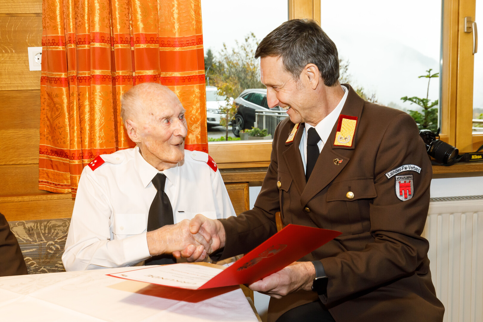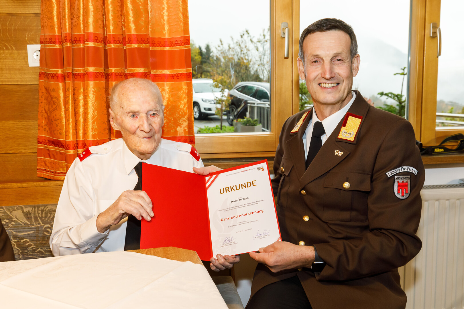 Der Landesfeuerwehrinspektor durfte Martin Zudrell eine Urkunde vom Österreichischen Bundesfeuerwehrverband überreichen – er ist der älteste Feuerwehrmann in Österreich.